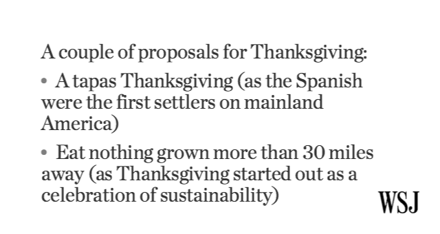 @WSJ Just stop. Tapas for Thanksgiving are fine in Madrid. Can't we just preserve some US traditions?? Or should we have kababs?Thanks. Twitter will use this to make your timeline better. UndoUndo