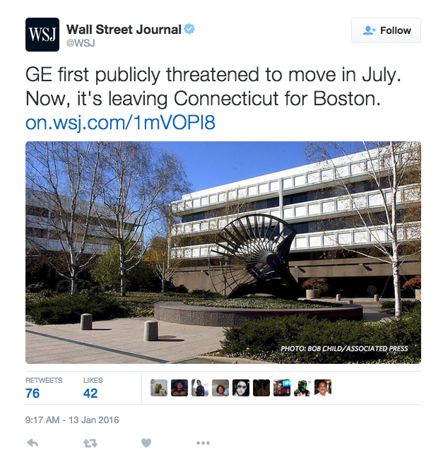@WSJ : when GE moves to "Taxachussetts" over high taxes in CT what name should be given CT?Thanks. Twitter will use this to make your timeline better. UndoUndo