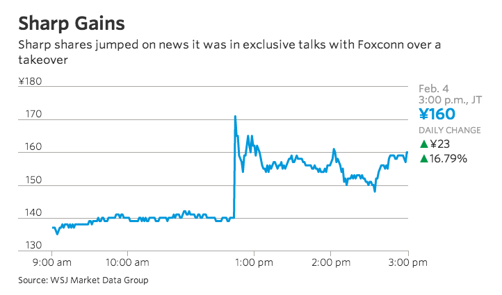 Sharp leaning toward Foxconn’s $5.5 billion takeover bid http://on.wsj.com/1SuI8eb pic.twitter.com/ZpWgFOHFnd