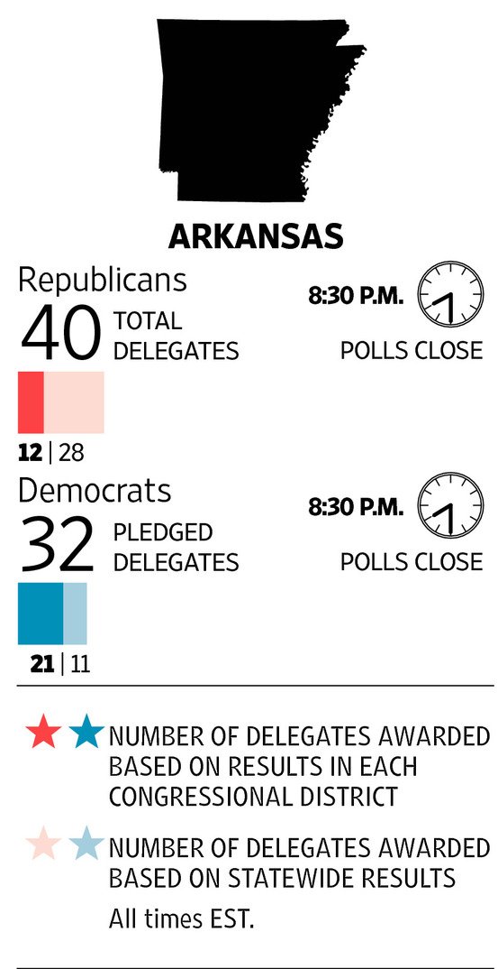 Polls in Arkansas close at 8:30 p.m. ET. Follow our live coverage: http://on.wsj.com/1QK20TS pic.twitter.com/cGCGOF7eIc