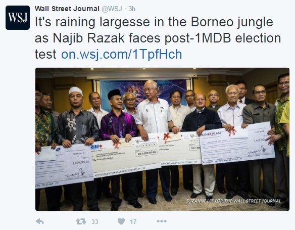 It's raining largess in the Borneo jungle as Najib Razak faces election test http://on.wsj.com/1Tqtpvu  (fixed typo)pic.twitter.com/mOVo6r2pZd