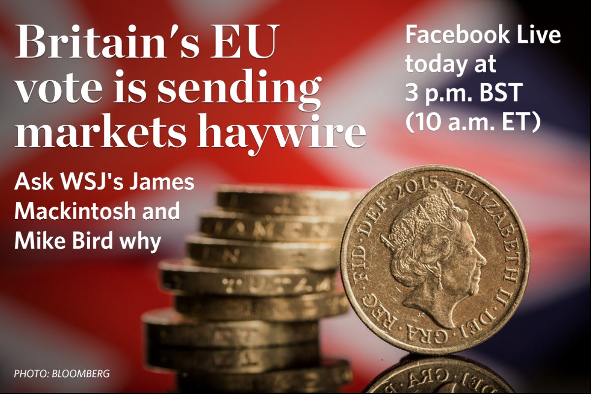 Join our Facebook Live to discuss market turmoil ahead of Britain's vote on EU membership. http://on.wsj.com/1Xn4z6Q pic.twitter.com/ljEkSgVmsw