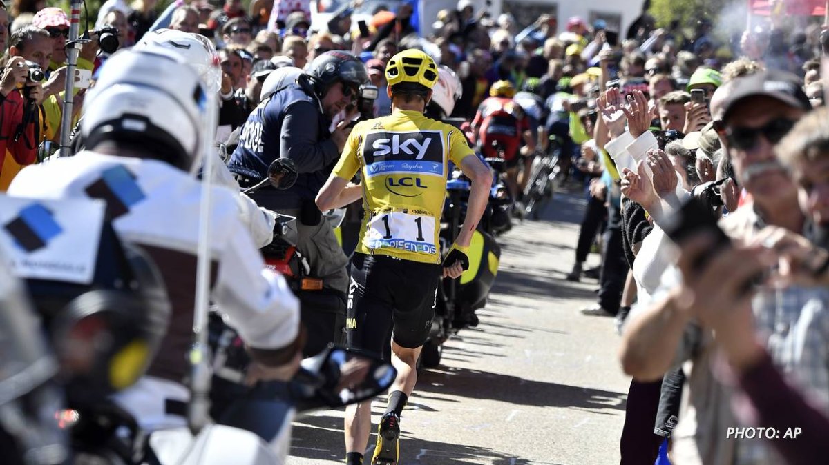 it seems the tour officials is working for frume what is this he should should be disqualified for running with out his bike
