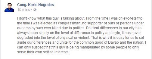 Political rival of Duterte denies that any of his staff or employees was killed.