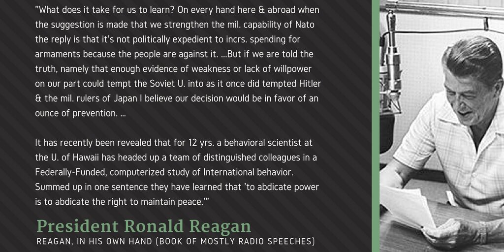"[T]o abdicate power is to abdicate the right to maintain peace.'" Ronald Reagan 1975. Citing 12 year U. of Hawaii behavioral science study.pic.twitter.com/4sQfIKDtQR