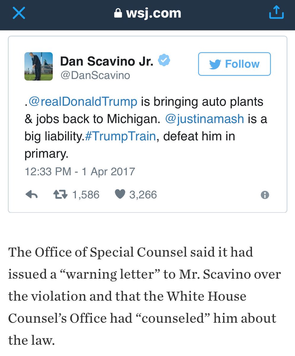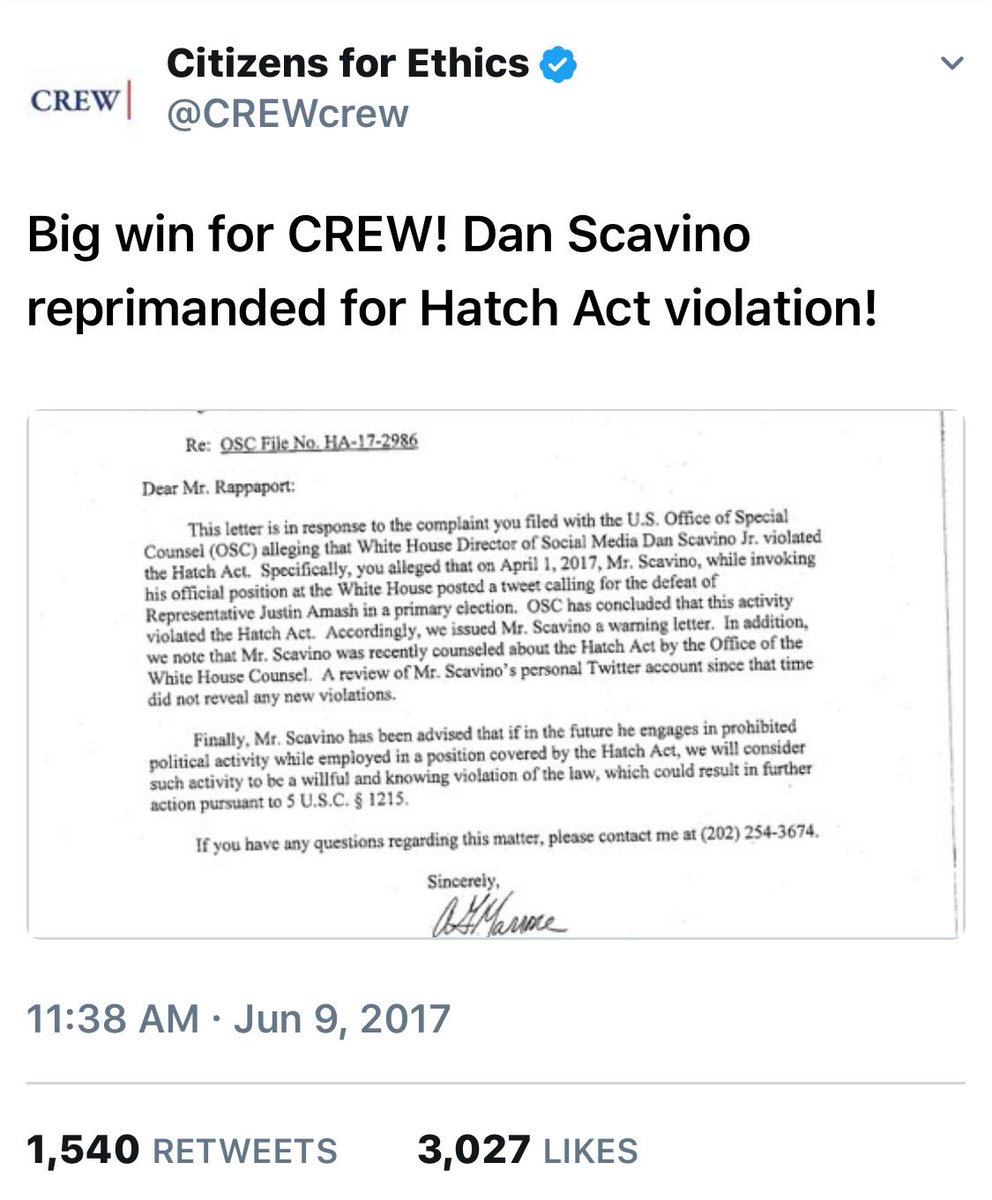 @DanScavino violated ethics rules on twitter.#HatchAct