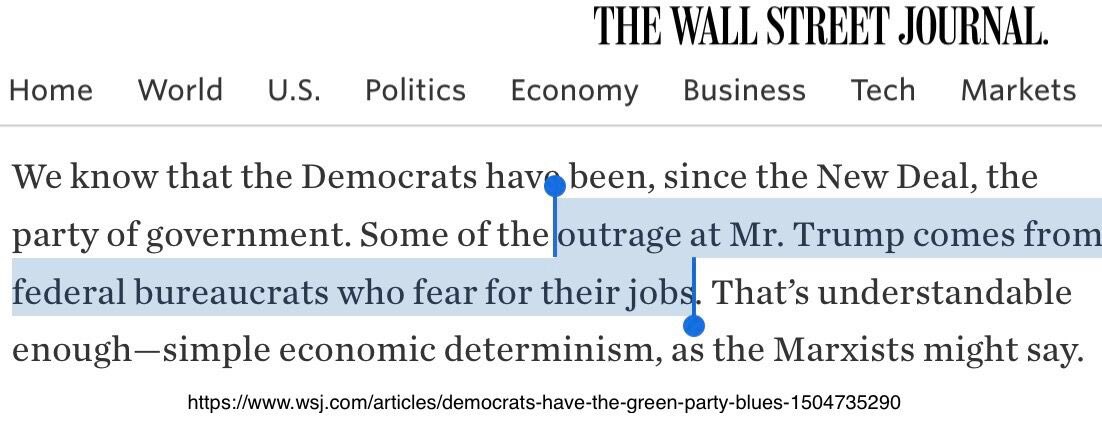 "outrage at Trump comes from federal bureaucrats who fear for their jobs...economic determinism, as Marxists might say"