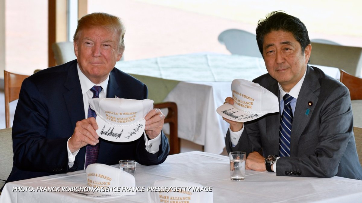 "First major Asian trip goal achieved: selling propaganda visor caps to Shinzo Abe!