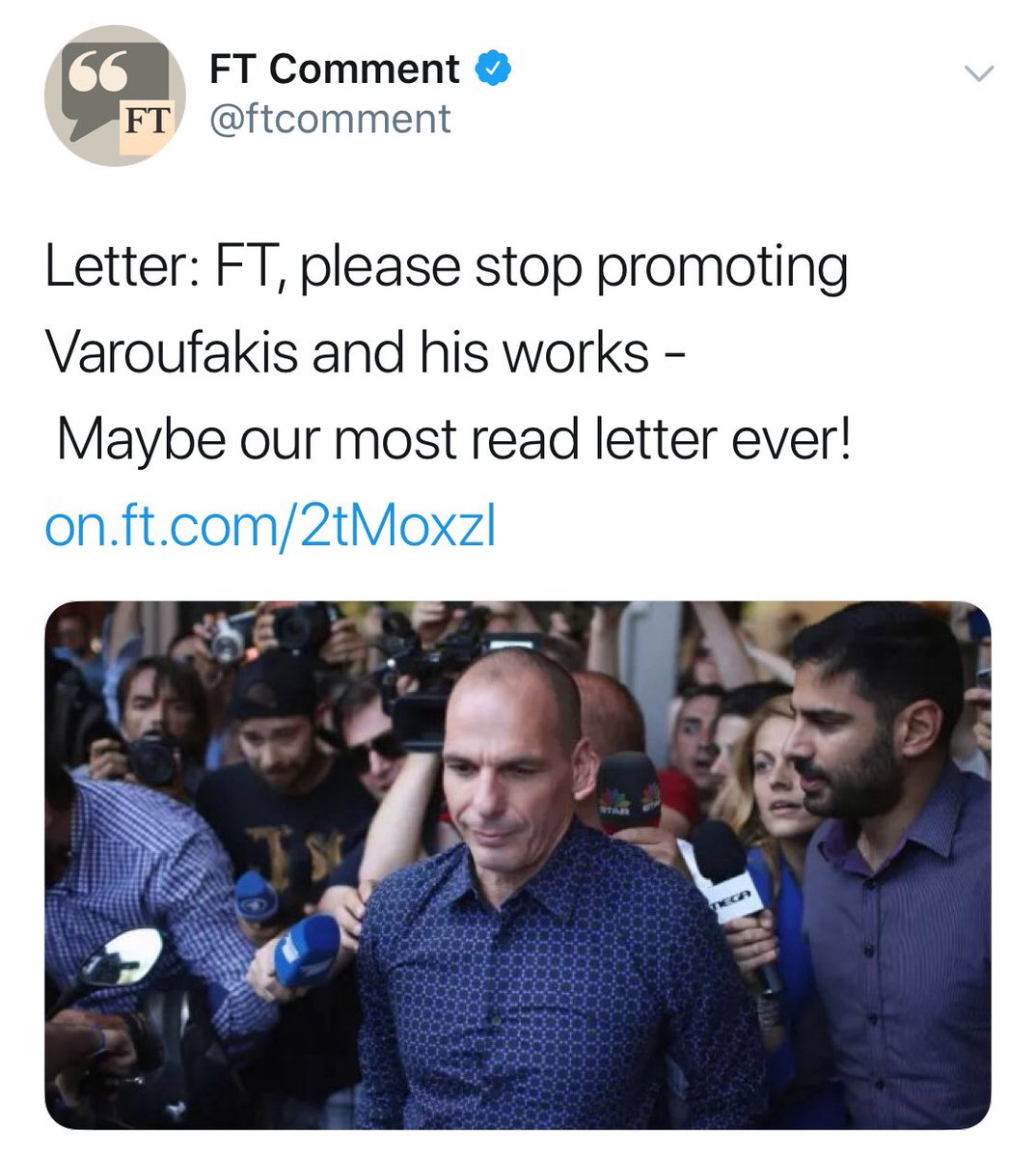 @WSJ , please consider the example of your good friends at the@FT and take note of how their readership responds to this completely unjustified glorification/promotion of Varoufakispic.twitter.com/KCn8kECIZc