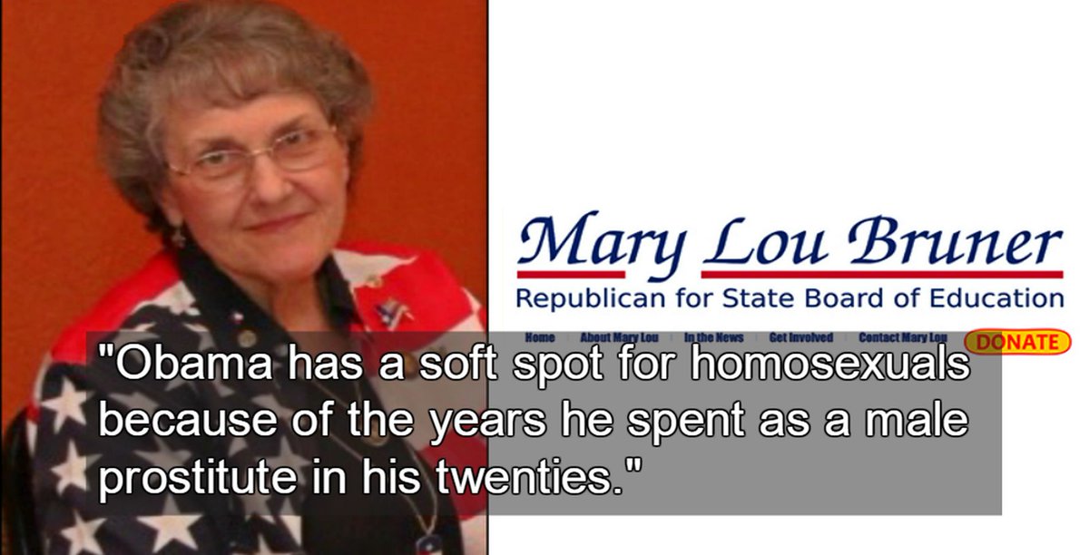 John Moffitt @JohnRMoffitt#MaryLouBruner running for TX State School Board under the platform of "Obama is a Gay Prostitute"#ElectionsMatter pic.twitter.com/pVRxDOlgza0 retweets 1 like -