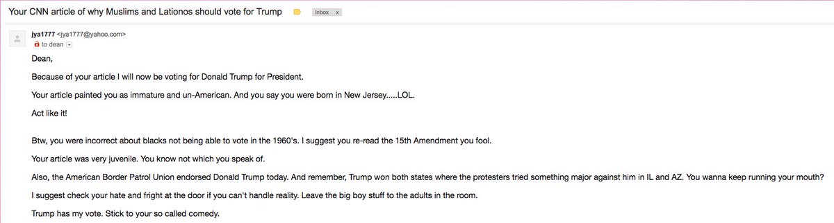 Dean Obeidallah @DeanofcomedyI love sharing emails sent to me by "outraged" Trump fans! Hope u laugh as much as I do at these! pic.twitter.com/km68QUlmf60 retweets 0 likes -