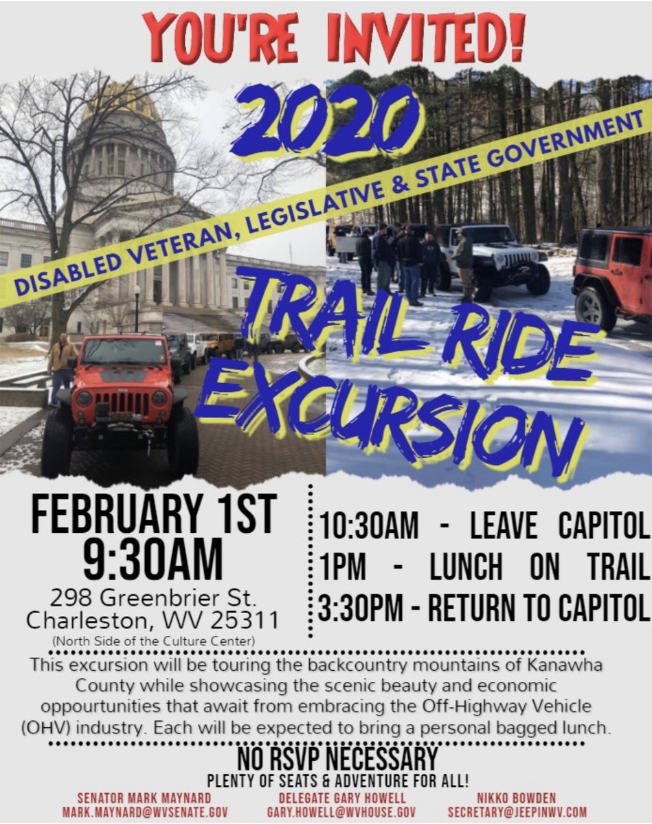 Media Alert: WV Jeep Club 2020 legislative event, trail ride today starts at Capitol, 9:30 a.m. : https://wvpress.org/breaking-news/media-alert-west-virginia-jeep-club-2020-legislative-event-and-trail-ride-today-feb-1/ …pic.twitter.com/iR72QzM0r1