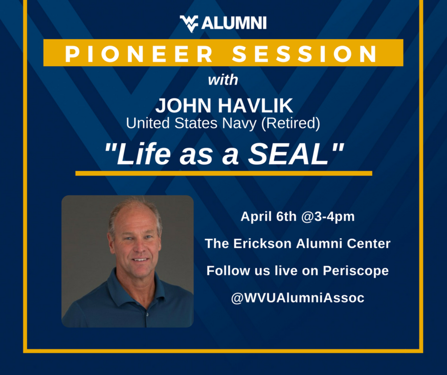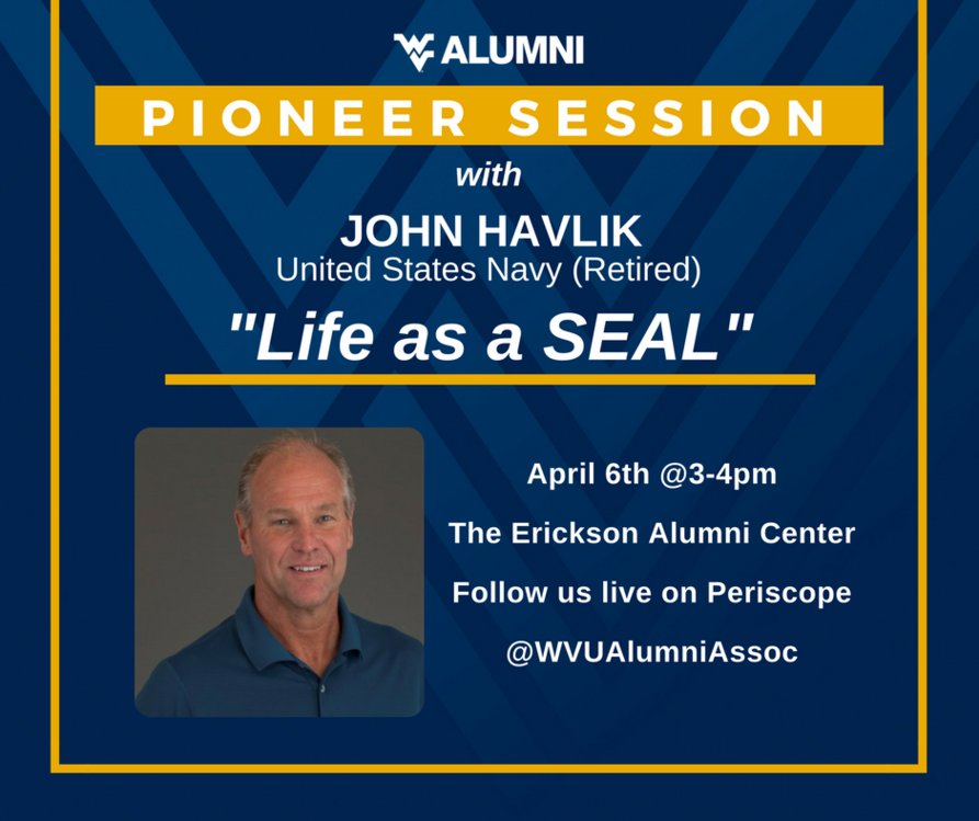 Former U.S. Navy Seal/WVU alum John Havlik joins us THIS THURSDAY for our next Pioneer Session! Visit http://www.alumni.wvu.edu/events/pioneer-sessions … to learn more!pic.twitter.com/iAJjArcRNS