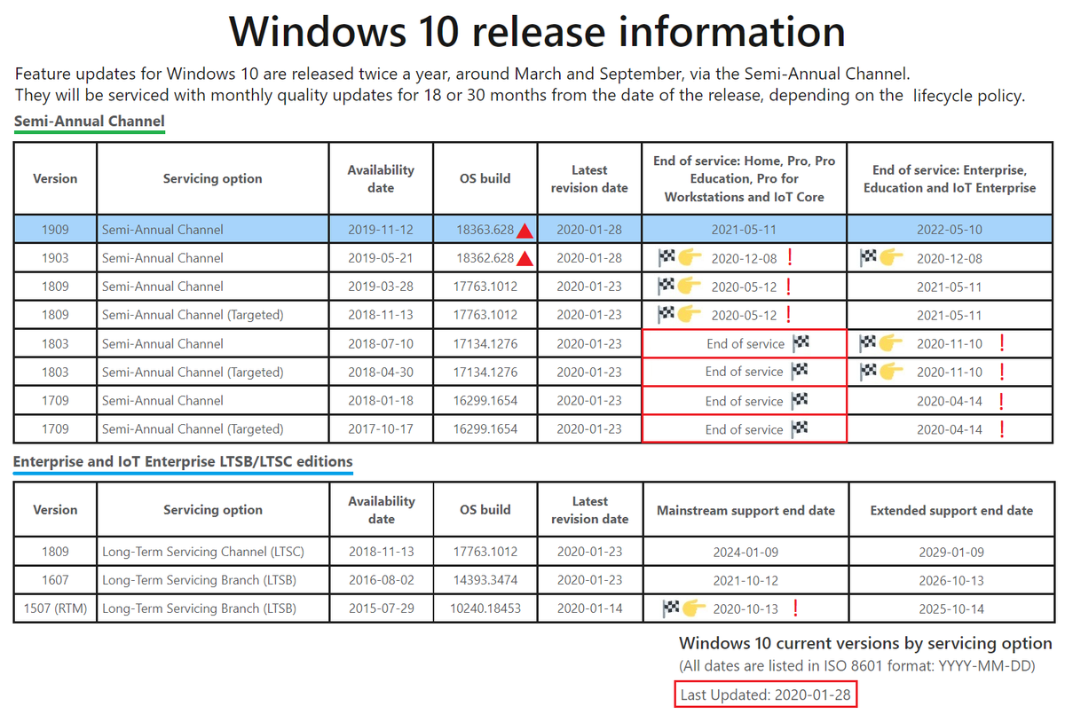 January 14/23/28, 2020 #CU Windows 10 rel. NFO https://docs.microsoft.com/en-us/windows/windows-10/release-information … 1903/1909 https://support.microsoft.com/help/4532695 1809 https://support.microsoft.com/help/4534321 1803 https://support.microsoft.com/help/4534308 1709 https://support.microsoft.com/help/4534318 1703 https://support.microsoft.com/help/4534296 1607 https://support.microsoft.com/help/4534307 1507 https://support.microsoft.com/help/4534306 pic.twitter.com/1yP48oETRY