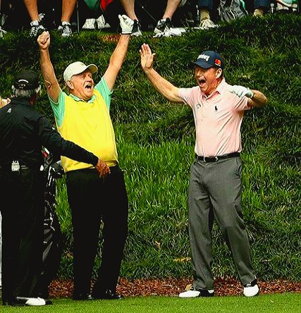 That moment a grandson makes a hole-in-one on Augusta National's Par 3 course. Grandfather Jack Nicklaus and besties Gary Player and Tom Watson let loose in celebration as Gary Nicklaus Jr. does the remarkable. How cool is this!!! photo courtesy of