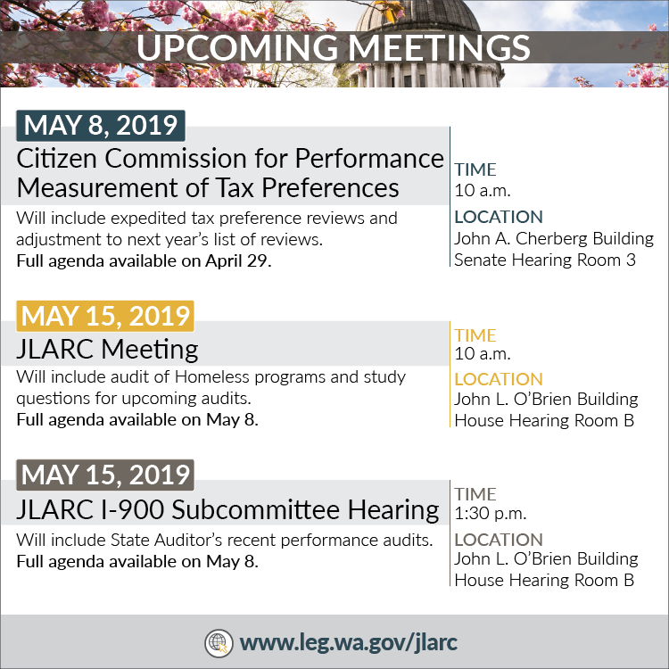 May is right around the corner! Check out these three meetings scheduled in May. Find more information and view agendas (once available) on the JLARC website: http://leg.wa.gov/jlarc/Pages/default.aspx …