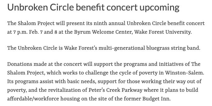 Look! The upcoming Unbroken Circle concert made @JournalNow@LynnFelder's "Best Bet' list for this week! The concert is free. Donations will be collected for The Shalom Project.