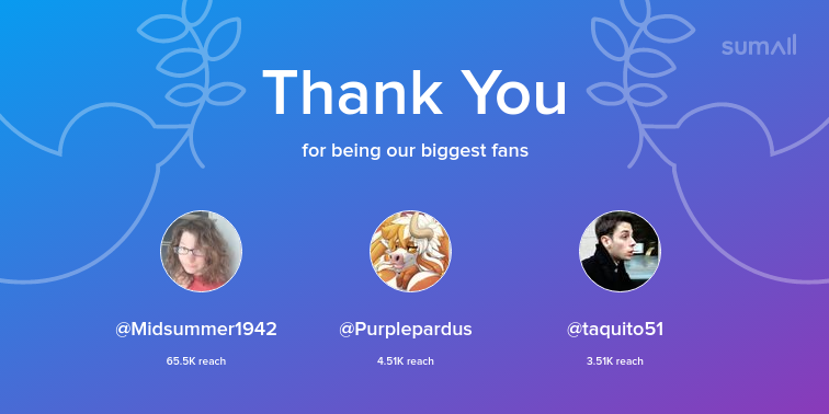 Our biggest fans this week: @Midsummer1942, @Purplepardus, @taquito51. Thank you! via https://sumall.com/thankyou?utm_source=twitter&utm_medium=publishing&utm_campaign=thank_you_tweet&utm_content=text_and_media&utm_term=4d2148ecf3cb47eeef43f669 …pic.twitter.com/WDOlV8cs4n