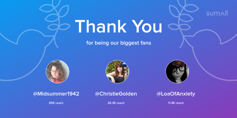 Our biggest fans this week: Midsummer1942, ChristieGolden, LoaOfAnxiety. Thank you! via https://sumall.com/thankyou?utm_source=twitter&utm_medium=publishing&utm_campaign=thank_you_tweet&utm_content=text_and_media&utm_term=4d2148ecf3cb47eeef43f669 …pic.twitter.com/PFm3yrcbvg