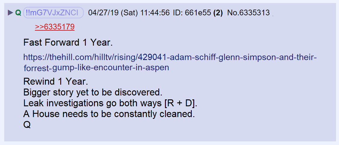 16) Q posted a link to an article by John Solomon who is hot on the trail connecting the Spygate plotters like Hannigan, Schiff and Glenn Simpson. Equal justice under the law means ALL leakers (R and D) will be prosecuted.