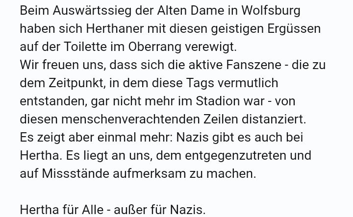 Warum antirassistische Arbeit bei Hertha B.S.C. so wichtig ist, zeigt dieses Foto aus der Gästetoilette in Wolfsburg. Hertha für Alle - außer für Nazis!