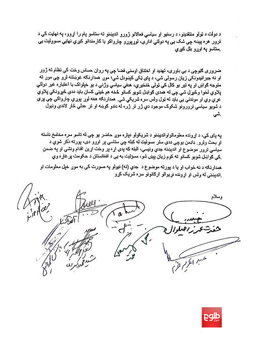 د اگست په ۲۱مه نېټه ښاغلي @RahmatullahN د ګواښلیک یوه کاپي خپره کړې وه چې د ده په ګډون ۱۷ تنه سیاستوال په کې شامل وو.https://twitter.com/TOLOnews/status/1298867944752058368 …