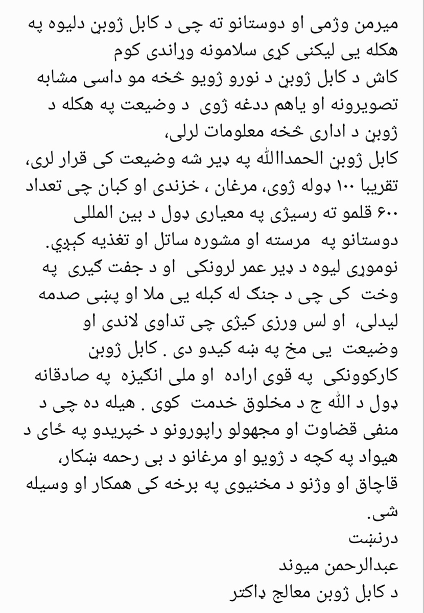 په ۲۰۰۷ کال کې مې د‌کابل ژوبڼ په لومړی ځل وليد د ښونځی زده کونکی وم او بيا کالونه وروسته په ۲۰۱۹ کال کې ورغلم چي ومې لید هغه پخوانی ژوبڼ وو هيڅ د پرمختګ تغير پکې نه وو راغلی له پسې خراب شوی وو .