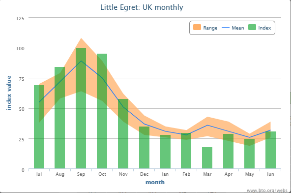 Little Egret is our most common egret in winter, peaking at an estimated 11,000 birds in September with young and continental birds joining the breeding pairs.