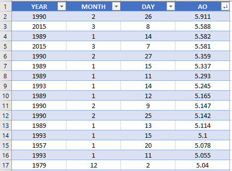 According to CDAS, the daily AO [NAM] value has only been > 5.0 16 days since 1950.pic.twitter.com/7jUWL4MSYx