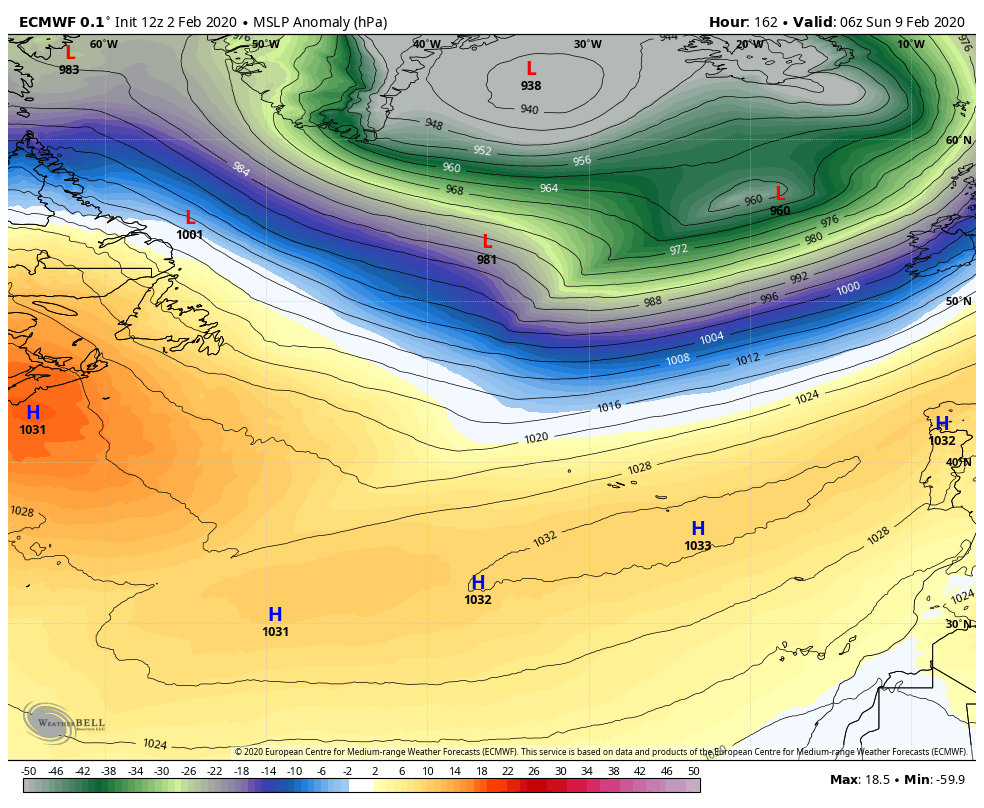 Euro model continues to advertise record Arctic Oscillation (+AO) next weekend. Why? Huge low pressure in the Arctic with min pressure of 938 mb - for perspective that's on par with Hurricane Matthew. Result: 250 mph Jet Stream in North Atlantic. Most cold air trapped in Arctic.pic.twitter.com/z1NNTpc2lI
