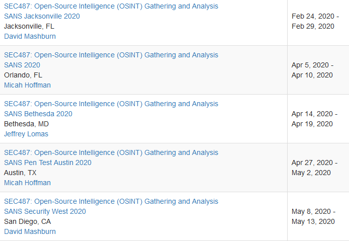 @d_mashburn,@thegumshoo,@BleuBloodHound or myself for the@SANSDefense#SEC487#OSINT class in the coming weeks/months. We are travelling around the USA and bringing this 6 day class to you in FL, TX, MD, and other locations. Visit https://sans.org/sec487 for details.pic.twitter.com/IaItuqUfgF