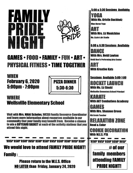 Just a reminder Family PRIDE Night is going on at Wellsville Elementary School on February 6th, from 5-7 PM. Reservations for this event are due to the WES main office by Friday, January 24th.pic.twitter.com/l0Kbsn8h6u