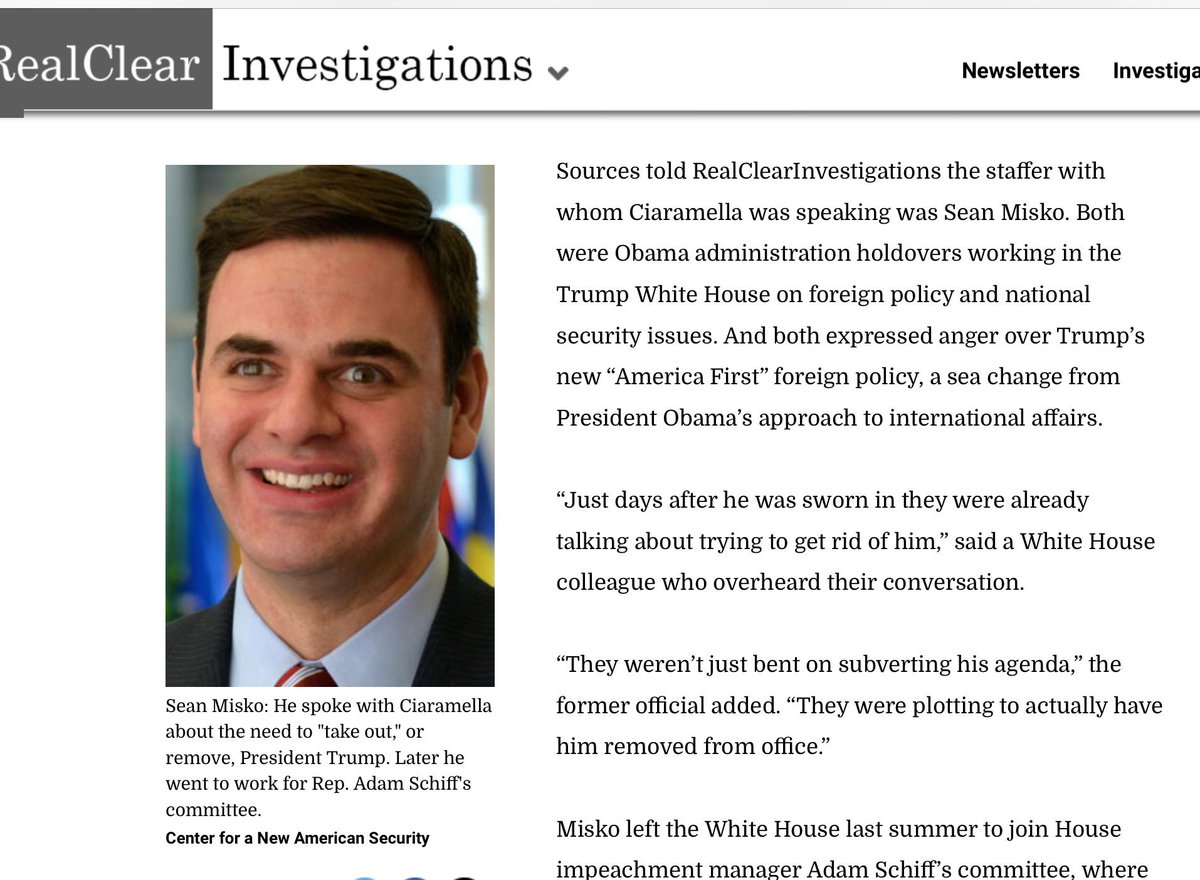 @CIA Analyst Eric Ciaramella & Sean Misko Overheard Within 2 Weeks of Trump’s Inauguration “Plotting how to remove the president from office” “How to take out the president” “We need to take him out” “We need to do everything we can to... http://realclearinvestigations.com/articles/2020/ … https://twitter.com/gregrubini/status/1221146014163316736 …pic.twitter.com/Yrqifw0yAS