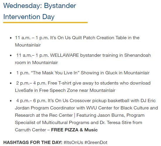#ItsOnUs Week Bystander Intervention Day. Join@WVUPeerAdvocate. Full schedule: http://goo.gl/eCJzai pic.twitter.com/rBpqvffDws