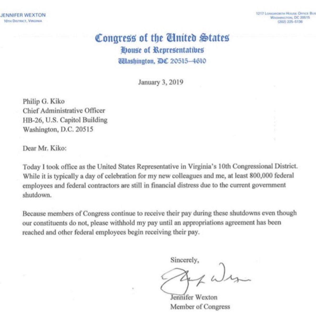I don’t believe it’s fair or appropriate for Members of Congress to continue to receive paychecks while federal employees & their families suffer. I’ve directed the Chief Administrative Officer of the House to withhold my pay until all our federal employees have been made whole.pic.twitter.com/o0AQHnJWvM