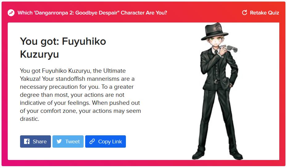 i saw someone take one of those stupid danganronpa buzzfeed quizzes so i went ahead and did all four of them because i could... even though i know next to nothing about this series aside from the first game. ok, that makes sense.pic.twitter.com/KxYEuS4fAs