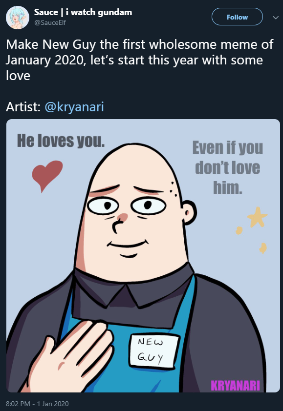 So someone posted this kinda mean-spirited comic, but people have responded by taking the "new guy" character and making him a wholesome, totally friendly dude. If this is the first meme of 2020, I'm all for it. Just a wholesome dude being wholesome. #NewGuy #NewGuy2020pic.twitter.com/2ZDd93KsdT