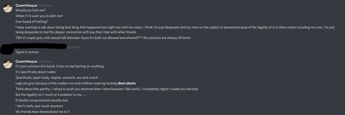 When I first started talking to Masque it was because I noticed she was having issues in the server, she never said why, but I reached out to her anyway We spoke for a bit and I figured it out. She absolutely despised this part of her, calling her self vile and had an immense--