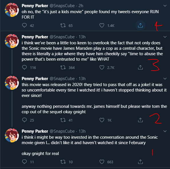 1 is literally just a reflection, she literally just suggests she might be thinking too hard about it 4 is a tweet referring to people who think she's looking to deep into the movie, something she suggested herself Why is always such a jump to"They're just dismissing those who--