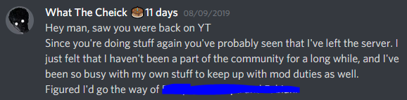 And I started thinking about it more and more. After a while I chose to cut ties with his community. I framed it as me leaving because I didn't really feel connected and while that's true I still felt uncomfortable, especially with how the other mods would talk about it all.