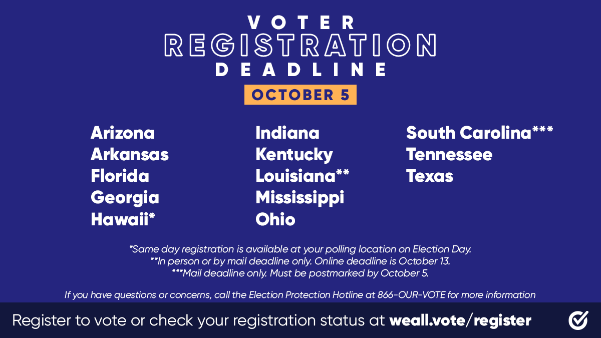 EDIT: Tennessee and South Carolina were not included in the original graphic and was our mistake. Update here:https://twitter.com/WhenWeAllVote/status/1313175798250172416?s=20 …