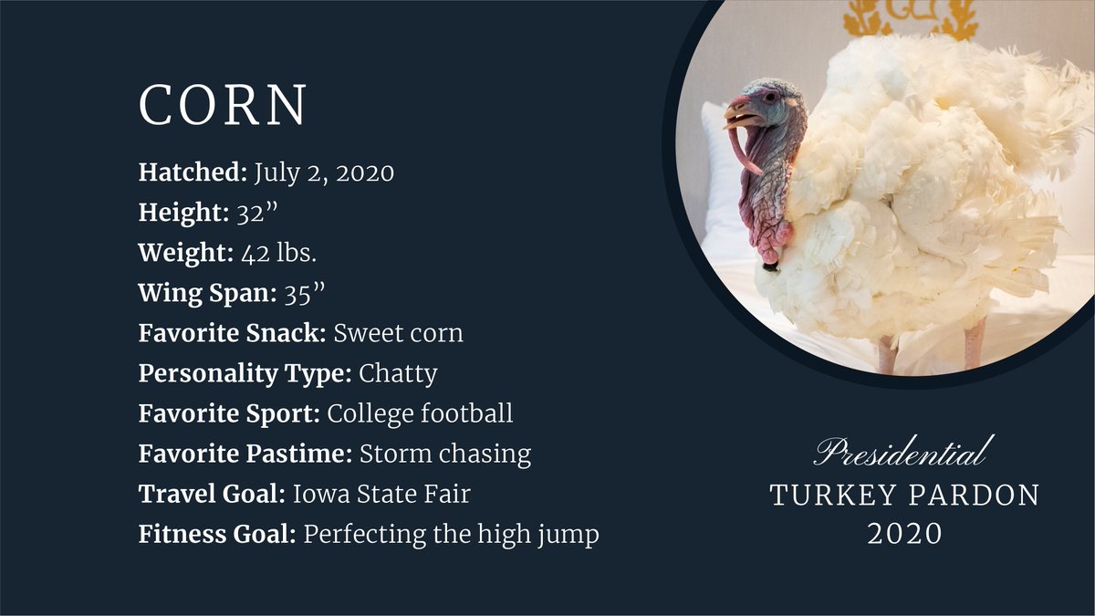 Meet your National Thanksgiving Turkey candidates! First up, "Corn," who loves college football and hopes to visit the Iowa State Fair one day:pic.twitter.com/eSFvxqddi7