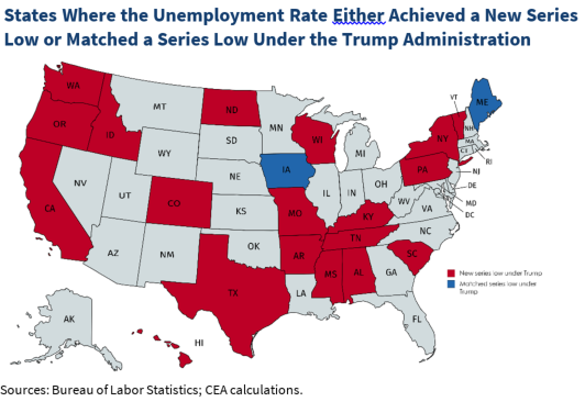 Under President Trump, people are finding jobs across the country. Since he took office, the unemployment rate in 21 states has either hit a new low or matched its lowest rate since at least 1976 when the series began.pic.twitter.com/CilMysymBa