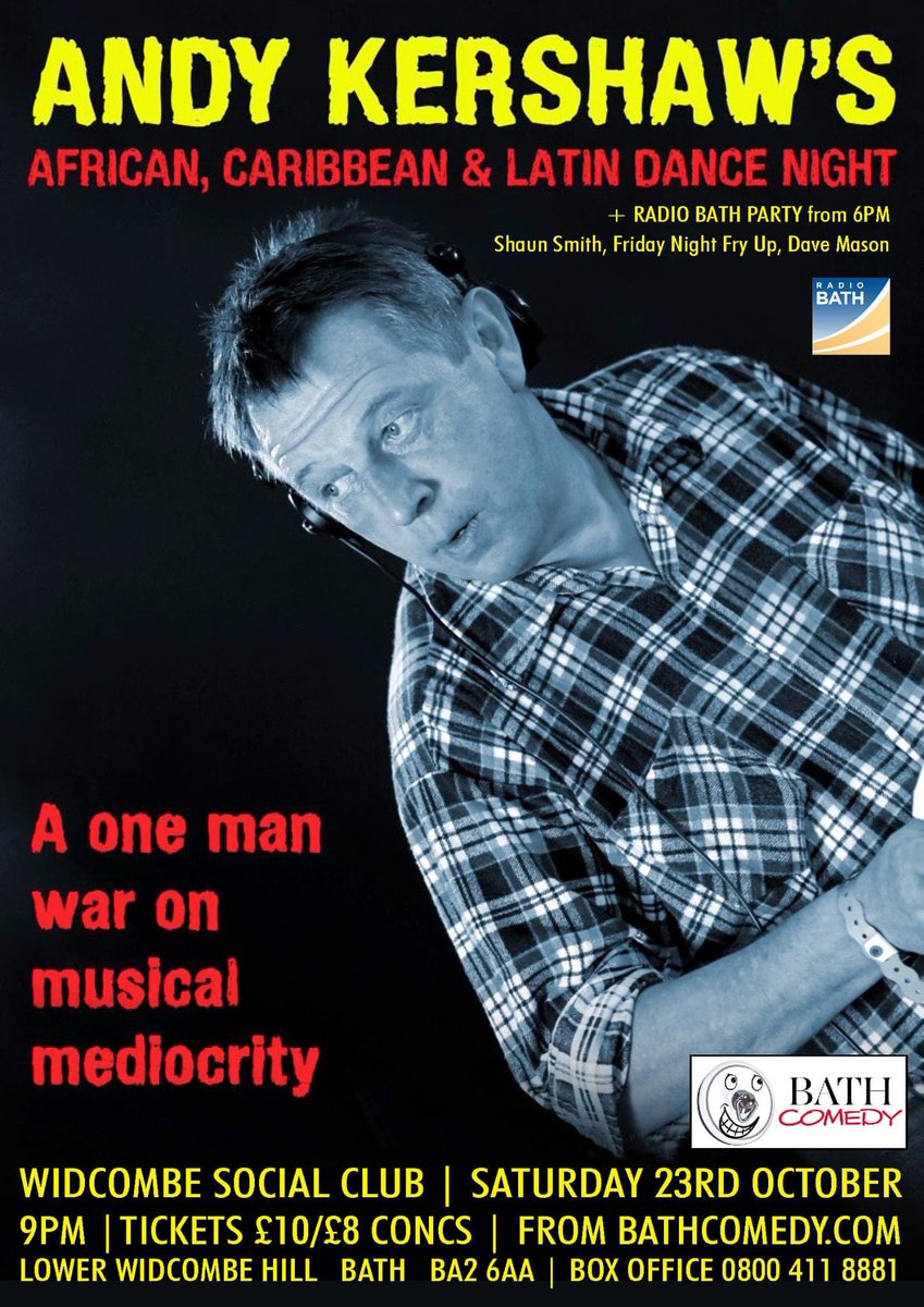 @THEAndyKershaw’s African, Caribbean & Latin Dance Night, headlines at@WidcombeSocialC -@RadioBathDAB kicks off at 6pm, (free), Andy plays from 9.15pm and tonight is about dancing! Online advance booking is at https://www.bathcomedy.com/whats-on?id=1364 … or pay on the door.pic.twitter.com/x6sVh4Gbos