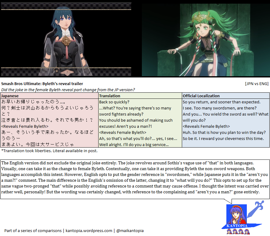 #SuperSmashBros Ultimate? One part changed a bit, but I think the fun double-meaning intent remains. Documented it for reference. See link! https://kantopia.wordpress.com/2020/02/01/smash-bros-byleths-reveal-trailer-did-the-joke-in-the-female-byleth-reveal-part-change-from-the-jp-version/ …#FireEmblem#FireEmblemThreeHousespic.twitter.com/MQMg7yXgid