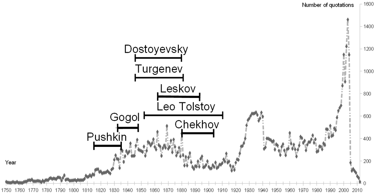 "Analysis of the quotation corpus of the Russian Wiktionary" https://arxiv.org/abs/2002.00734 Top authors: 1. Chekhov 2. Tolstoy 3. Pushkin 4. Dostoyevsky 5. Turgenevpic.twitter.com/JvnO1fJpfi