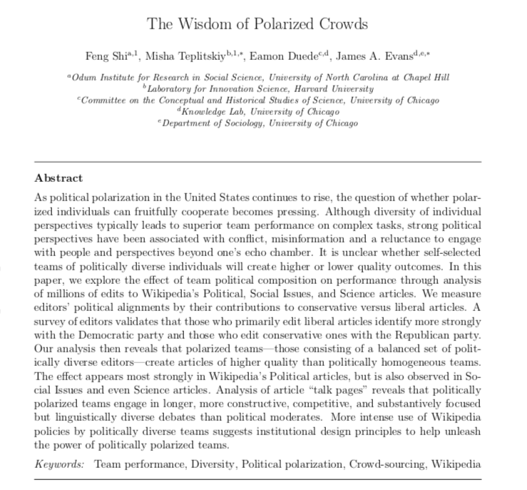 Political polarization produces better Wikipedia articles: "politically polarized teams engage in longer, more constructive, competitive, and substantively focused but linguistically diverse debates than political moderates." link: https://arxiv.org/abs/1712.06414 pic.twitter.com/99GQweYTSh