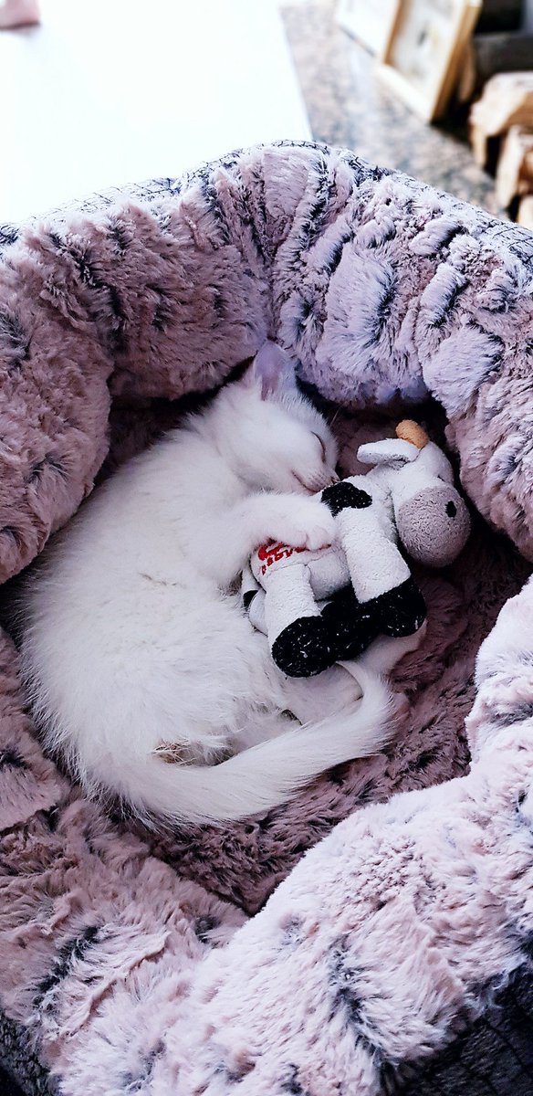 So I guess I'm a cat person now! Adopted this little girl at the weekend. Completely white except for two black spots on her head. Seemed fitting to call her 'Domino' :) She's sleeping here. But she's full of energy and enjoys climbing up the curtains!
