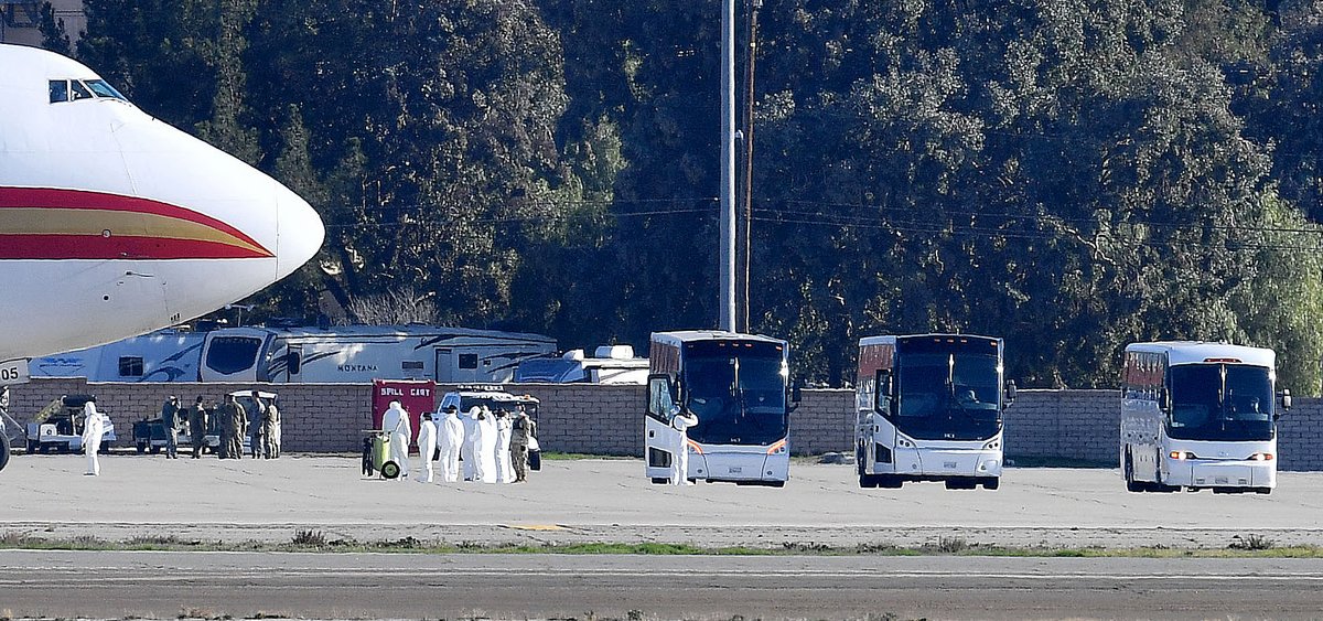 A team in white biohazard suits watch as some of the approximately 200 passengers walk to waiting buses upon arriving on a charter flight from Wuhan, China, after landing at March Air Reserve Base in Riverside, Calif. Wednesday morning.