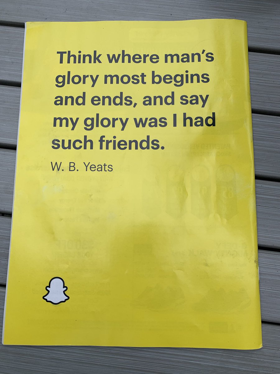 Snap with an off brand W.B. Yeats-influenced ad on the back of this week’s New Yorker. Translation: “We’re not just for Gen Z, we promise!”pic.twitter.com/3UzmewVfeq